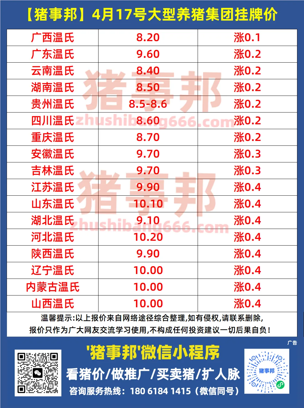 温馨提示:以上报价为当晚信息汇总的大致价格,具体价格请关注“猪事邦”微信小程序,信息只作为广大猪友交流学习使用,不构成任何投资建议一切后果自负。