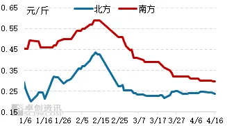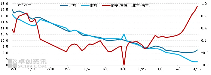 自14日开始,北方某龙头公司出栏量明显缩减,导致供应端阶段性减量,同时伴随二次育肥补栏进场略增,截留部分110-125公斤猪源,供需阶段性失衡推动北方猪价快涨。这期间,中部地区上涨明显,以河南地区为例,近三天猪价累计上涨0.5元/公斤左右。中部地区作为猪价上涨的引擎,推动东北和南方猪价跟涨。但南方跟涨幅度明显不及北方,本轮猪价上涨过程中,南北价差在迅速扩大。据卓创资讯监测数据显示,截至15日,北方均价为9.22元/公斤,南方为8.29元/公斤,两者价差扩大至0.93元/公斤,较4月10日走阔0.56元/公斤。
