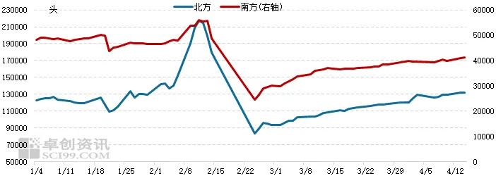 造成南北价差的主因在于需求的不匹配,全国生猪屠宰产能最集中区域为河南、山东、江苏、安徽、湖北、河北等所在的华东、华中地区,其次为东北,最后是西南和华南市场,而随着猪价拐点临近,部分社会库存有增量意向,加之食品加工厂亦增加备货,中部具有分割能力的屠企高负荷生产。据卓创资讯监测数据显示,以河南为例,4月16日省内样本企业日度屠宰量为37390头,与2025年11-12月屠宰水平接近。在当下鲜销淡季,无疑增加中部猪源消化速度。但西南和华南屠宰有限,在当前供应过剩阶段,消化劣势尽显。