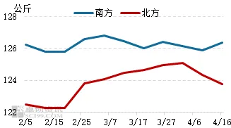 而通过对比南北方交易均重数据发现,北方屠宰增量加速猪源消化的过程中,生猪交易均重有相对明显下滑,而南方均重下行缓慢,甚至有反弹迹象。据卓创资讯监测数据显示,本周四南方交易均重为126.36公斤,环比升高0.38%;而北方交易均重为123.76公斤,环比降低0.45%。自4月初开始,北方均重持续走低,而南方均重在125.88-126.39公斤徘徊,未出现明显积压。而从肥标差数据也能得到验证,4月16日,南方肥标差均值为0.30元/斤,较4月初仅收窄0.03元/斤。