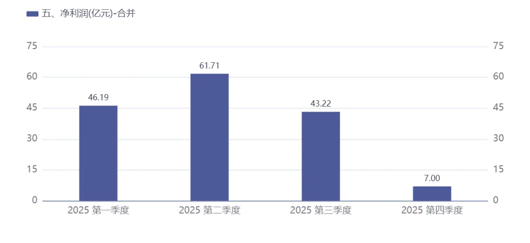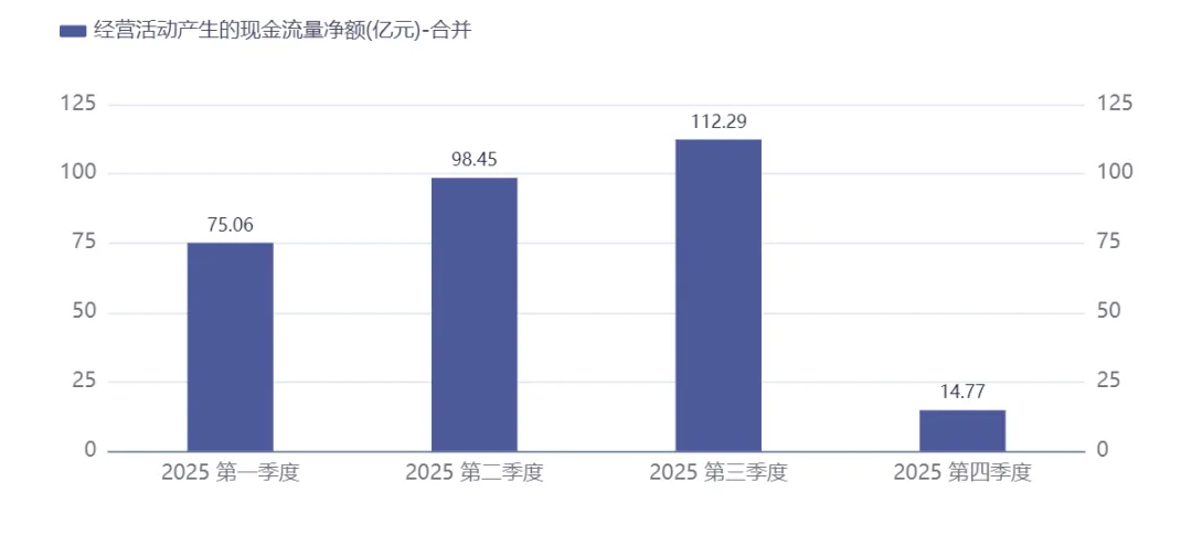 2025年四季度净利润大幅下滑到7亿元,经营现金净流量下滑到14.77亿元,相对于前三季度大幅降低。
