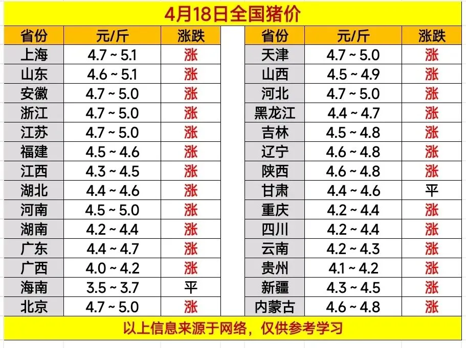 2026.4.18.——明日猪价预测 养羊网 2026-04-17 2026.4.18.——明日猪价预测 养羊网 2026-04-17 上一篇:2026.4.18 明日猪价 下一篇:猪价跌了,养殖户凭啥不再慌?(二) | 期货工具成了“最后一道城墙” 您可能还会对下面的文章感兴趣111: 相关文章 大反转!33家猪肉股集体跟涨,猪价或将回暖?19家上市猪企季报披露,或集体陷入亏损.... 2025年4月13日全国各地生猪价格信息 养殖一头肉牛能赚5300元 还能上车吗?