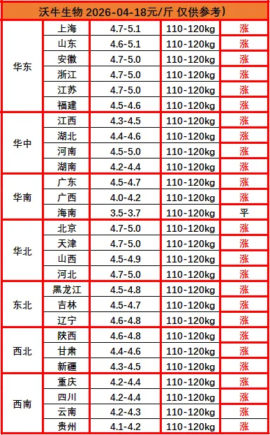? ? 猪价播报沃小牛,助力养猪牛牛牛!各位养猪的老铁们,大家好!我是沃小牛,明天是2026年04月18日,最新猪价已经出来了:继续涨,4月的第一个满堂红!明日全国猪价延续普涨格局,市场情绪明显回暖,仅海南持平。本轮上涨主要源于前期集中抛压释放、屠宰端五一备货支撑,叠加二次育肥抄底情绪托底,整体呈温和修复态势。高价区与低价区仍存明显分化,上涨节奏偏谨慎,未出现抢猪式跳涨。这波普涨更像是漫长寒冬里的一口喘息,而非供需反转的号角。上涨持续性仍存隐忧,供给高峰未过,消费增量难撑单边行情,养猪人不必过度乐观,逢高出栏、稳扎稳打才是应对之道。