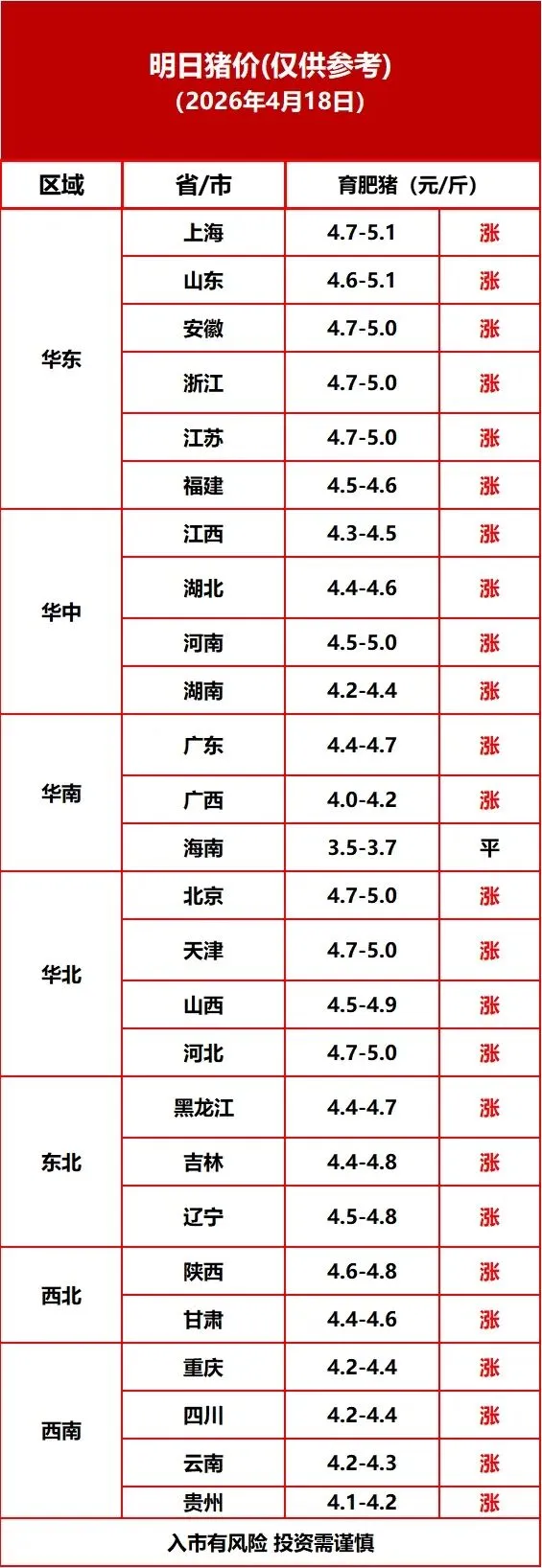 【今日猪价】4月18日全国猪价:延续普涨态势,稳中上行,全国多地飘红,海南持平,无下跌省份 养羊网 2026-04-18 【今日猪价】4月18日全国猪价:延续普涨态势,稳中上行,全国多地飘红,海南持平,无下跌省份 养羊网 2026-04-18 上一篇:猪价有变,涨跌调整(2026-04-18) 下一篇:今日鸡蛋价格行情(2026-04-18) 您可能还会对下面的文章感兴趣111: 相关文章 【番外】今日乐·MP44s擎天柱 成都龙泉天然气涨价? 鸡蛋价格一览|2026年1月21日鸡蛋价格(明日早知道) 大洋路鸡蛋价格2026年 1 月 11 日报价