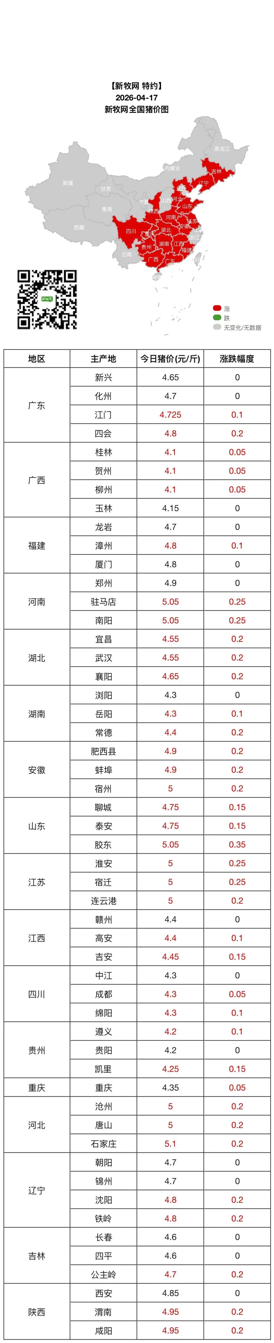据新牧网监测的生猪报价信息统计,2026年4月17日新牧猪价指数73.46,较昨日上调1.97个点。今日全国生猪均价为4.62元/斤,较昨日上调0.12元/斤。较上周同期上调0.17元/斤,上涨幅度3.82%。