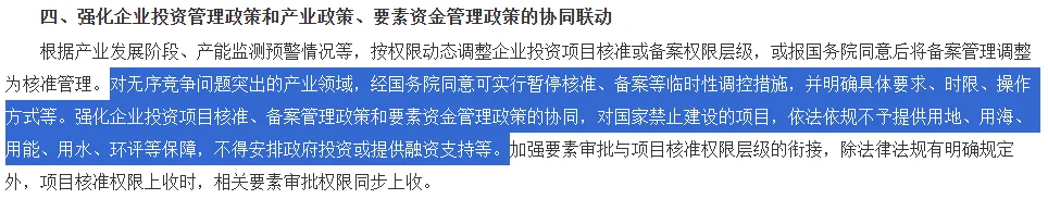 根据产业发展阶段、产能监测预警情况等,按权限动态调整企业投资项目核准或备案权限层级,或报国务院同意后将备案管理调整为核准管理。对无序竞争问题突出的产业领域,经国务院同意可实行暂停核准、备案等临时性调控措施,并明确具体要求、时限、操作方式等。