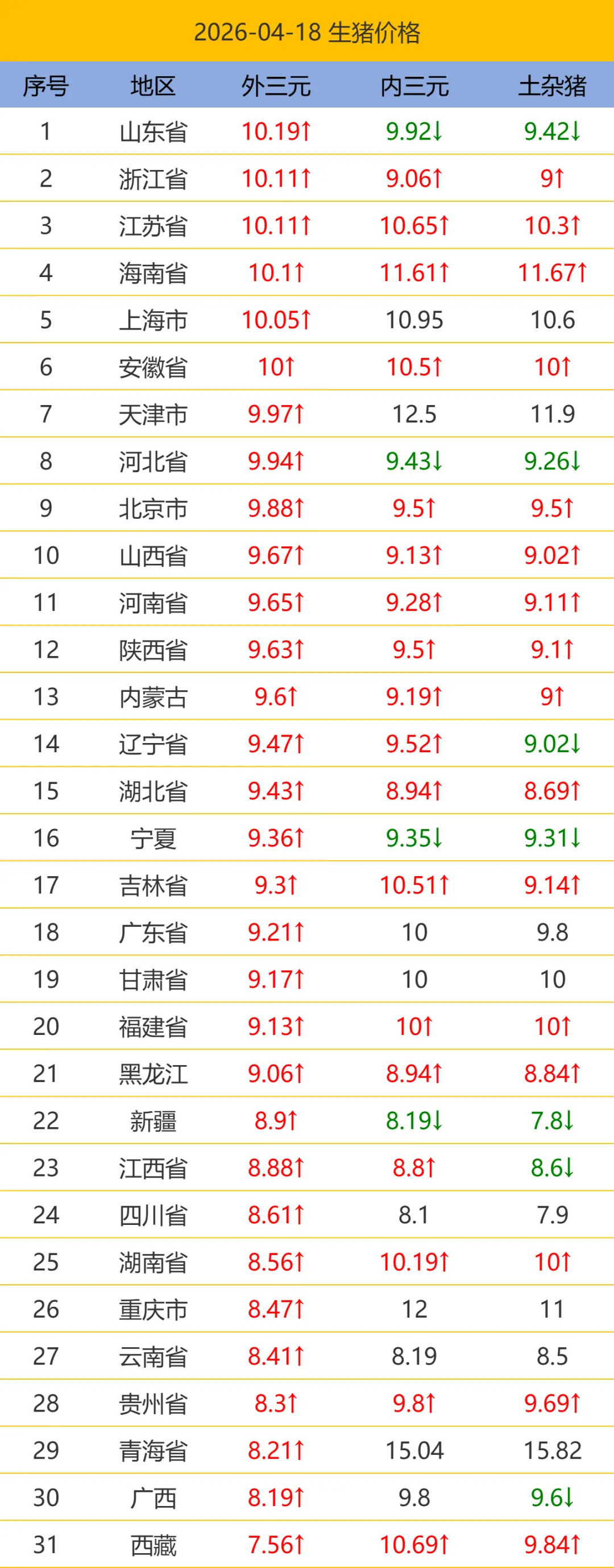 2026.04.18最新生猪价格.今日猪价,全国猪价. 养羊网 2026-04-18 2026.04.18最新生猪价格.今日猪价,全国猪价.以下猪价为平均价格(单位:元/公斤),市场时刻变动,报价不作交易依据,仅供参考。【需要更详细信息请到小程序查看】 养羊网 2026-04-18 上一篇:猪价有望逐步企稳回升,全年或将呈现“前低后高、窄幅波动”特征 下一篇:4月18日全国鸡蛋价格 您可能还会对下面的文章感兴趣111: 相关文章 不多但真 ? 海拉尔市区出小羊 2025年4月13日全国各地生猪价格信息 【明天猪价】2026.2.19全国猪价 (已更新)
