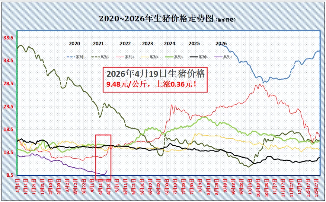 一夜起飞,猪价上涨“六亲不认”!附:4月19日猪价时光荏苒,4月渐入中下旬,国内生猪市场,虽然,供需基本面维持宽松的局面,但是,碍于近期猪价超预期下降,养殖端面临显著亏损的局面,市场底部支撑转强,国内猪价迎来“拐点”,市场呈现逆势拉涨的走势!短期内,猪价底部支撑或将转强,五一小长假前,国内猪价重心或逐步回升至9.5~10元/公斤左右,但是,由于供应压力依然存在,猪价反弹仍面临一定下行的风险! 从最新消息了解,一季度末,国内母猪存栏降至3904万头,母猪存栏高位回落,基本降至此前官方公布的3900万头正常保有量!但是,今年一季度,官方再次调整正常保有量降至3650万头,产能去化压力依然较大,尤其是,现阶段下,国内生猪育肥PSY数值处于高位,生猪产能存在隐形供应增加的风险。尤其是,虽然,母猪存栏产能去化逐步加快,但是,市场对于产能是否真正去化存在质疑,毕竟,部分养殖户担忧母猪产能淘汰是否是“左手换右手”,过剩产能是否是流入放养公司,这对于市场情绪有一定影响! 从供应来看,基于前期母猪存栏4043万头,且,产能去化缓慢,主流机构认为,2026年4-5月份,生猪供应整体宽松,市场中小标猪供应能力充足!本月,规模猪企出栏计划1441万头,环比增加近4.24%,生猪供应过剩凸显,尤其是,出栏时间减少,日均出栏计划环比或大幅提升! 在需求端,目前,猪肉购销需求缓慢改善,低价猪肉刺激下游购销积极性,且,市场抄底心态转强!尤其是,生猪价格止跌上涨,这带动了市场二育的积极性,南北多地二育出现集中补栏标猪现象,市场抢购标猪以及仔猪现象增多。且,受标猪价格偏低,屠宰场继续分割入库,样本屠企开工率回升至37.12%左右,市场对于猪源承接能力转强! 由此分析,目前,国内生猪购销呈现“双增”的局面,不过,由于月内猪价超预期下降,且,集团猪企月内出栏节奏较快,进入中下旬后,养殖端挺价操作增多,集团猪企缩量拉涨的心态转强!且,随着五一小长假临近,市场看涨心态也逐步回升,二育以及分割入库支撑转强,短暂猪价或迎来“小阳春”! 据数据分析,受屠宰场调价,预计,4月19日,外三元标猪报价上涨至9.48元/公斤,后市关注集团猪企出栏以及二育情绪等变化,尤其是,关注猪价重心上移后养殖端出栏情绪的变化!