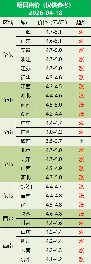 明日猪价(2026年04月18日,全国猪价飘红!) 养羊网 2026-04-18 明日猪价(2026年04月18日,全国猪价飘红!) 养羊网 2026-04-18 上一篇:全国各地2026.4.19~明日最新猪价(猪价已更新!) 下一篇:云南鸡蛋价格参考:4月18日!! 您可能还会对下面的文章感兴趣111: 相关文章 2026.02.28-明天猪价(猪价蓄势待发,一路飘红上涨!) 近期价格更新!!! 猪价调整!【明天猪价】1月9日全国猪价涨跌表! 2025年4月13日全国各地生猪价格信息