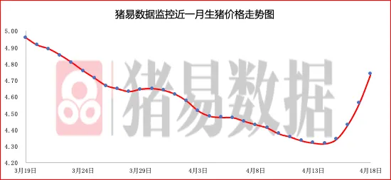 据猪易数据监测数据显示,2026年4月18日标准体重生猪平均价格为9.48元/公斤,较昨日猪价上涨0.36元/公斤,张幅为3.95%,同比25年同期14.94元/公斤下跌5.46元/公斤,跌幅为36.55%。
