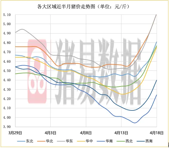 华北、华东、华中、华南、西北、西南、东北地区猪价呈现上涨,生猪平均价格呈现上涨。