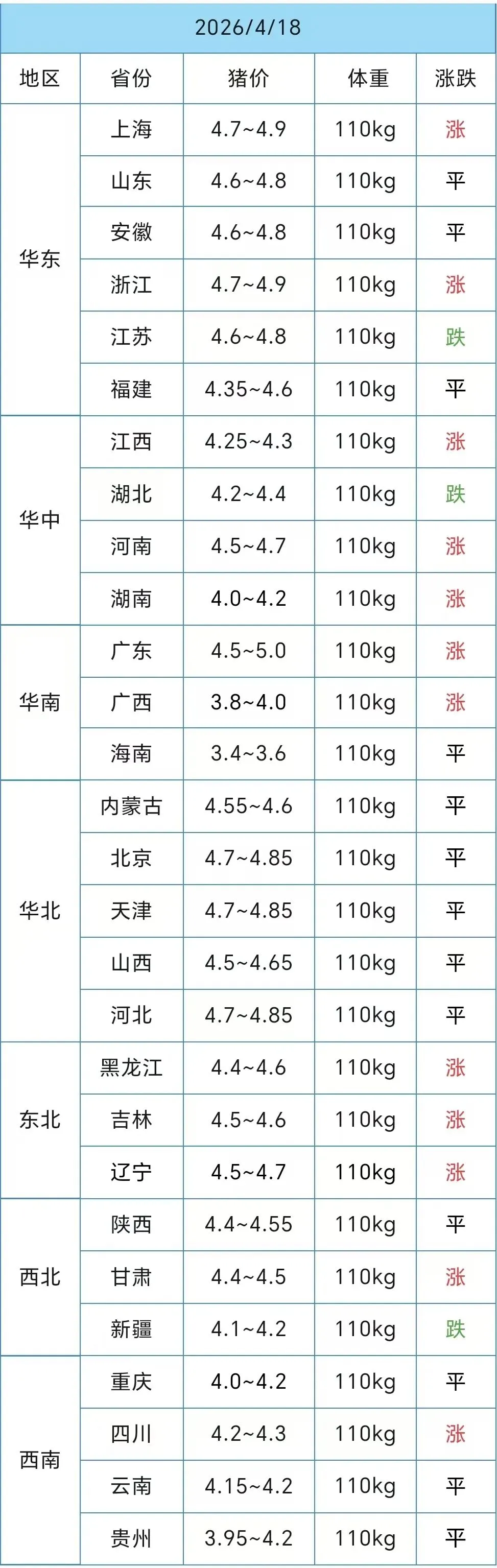 2026-04-18今日猪价 养羊网 2026-04-18 2026-04-18今日猪价 养羊网 2026-04-18 上一篇:2026 . 4 . 18 鸡蛋价格 下一篇:猪价8年新低!养殖户一头亏几百,拐点和机会全说透! 您可能还会对下面的文章感兴趣111: 相关文章 【猪价】2026年2月12日全国最新猪价! 新社惠农:多领域助力乡村全面进步 【明日猪价】2026-1-22全国生猪价格(猪价大范围下跌) 近期价格更新!!!