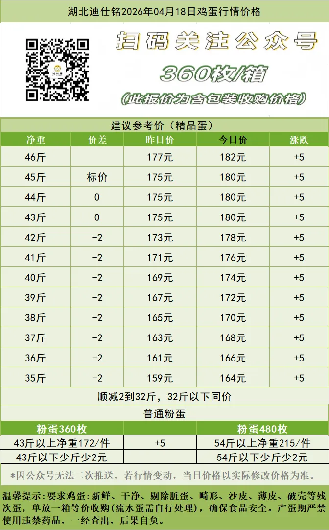 湖北迪仕铭2026年04月18日鸡蛋行情价格 养羊网 2026-04-18 湖北迪仕铭2026年04月18日鸡蛋行情价格 养羊网 2026-04-18 上一篇:猪价8年新低!养殖户一头亏几百,拐点和机会全说透! 下一篇:2026年4月18日鸡蛋价格分析 您可能还会对下面的文章感兴趣111: 相关文章 金善禹娃娃超好价出! 2026.2.14明日全国最新猪价信息(上涨为主!) 4月5日 这个星期鸡蛋又够吃了 2025年10月4日全国各地生猪价格信息