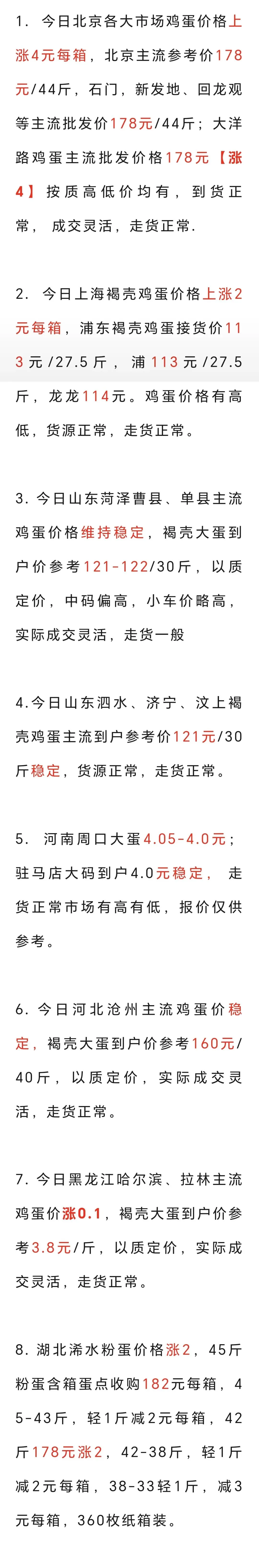 2026年4月19日各地鸡蛋价格(稳) 养羊网 2026-04-19 2026年4月19日各地鸡蛋价格(稳) 养羊网 2026-04-19 上一篇:明日(2026年4月20)鸡蛋价格预测 下一篇:4月18日 鸡蛋最新价格 您可能还会对下面的文章感兴趣111: 相关文章 近期价格更新!!! 近期价格更新!!! 猪价六连涨!全国三十多省全面飘红,直冲7元区间! 台州卖羊