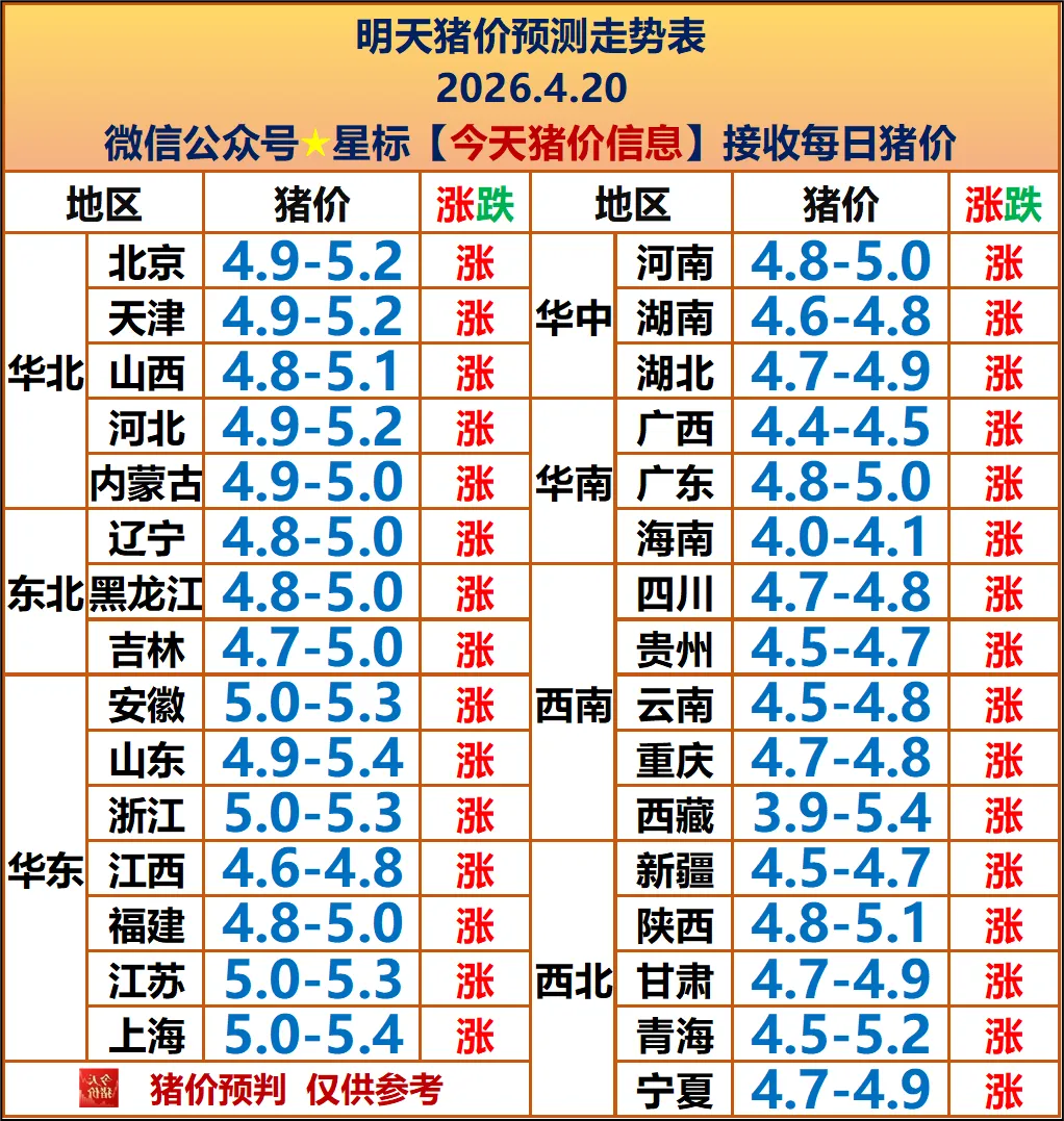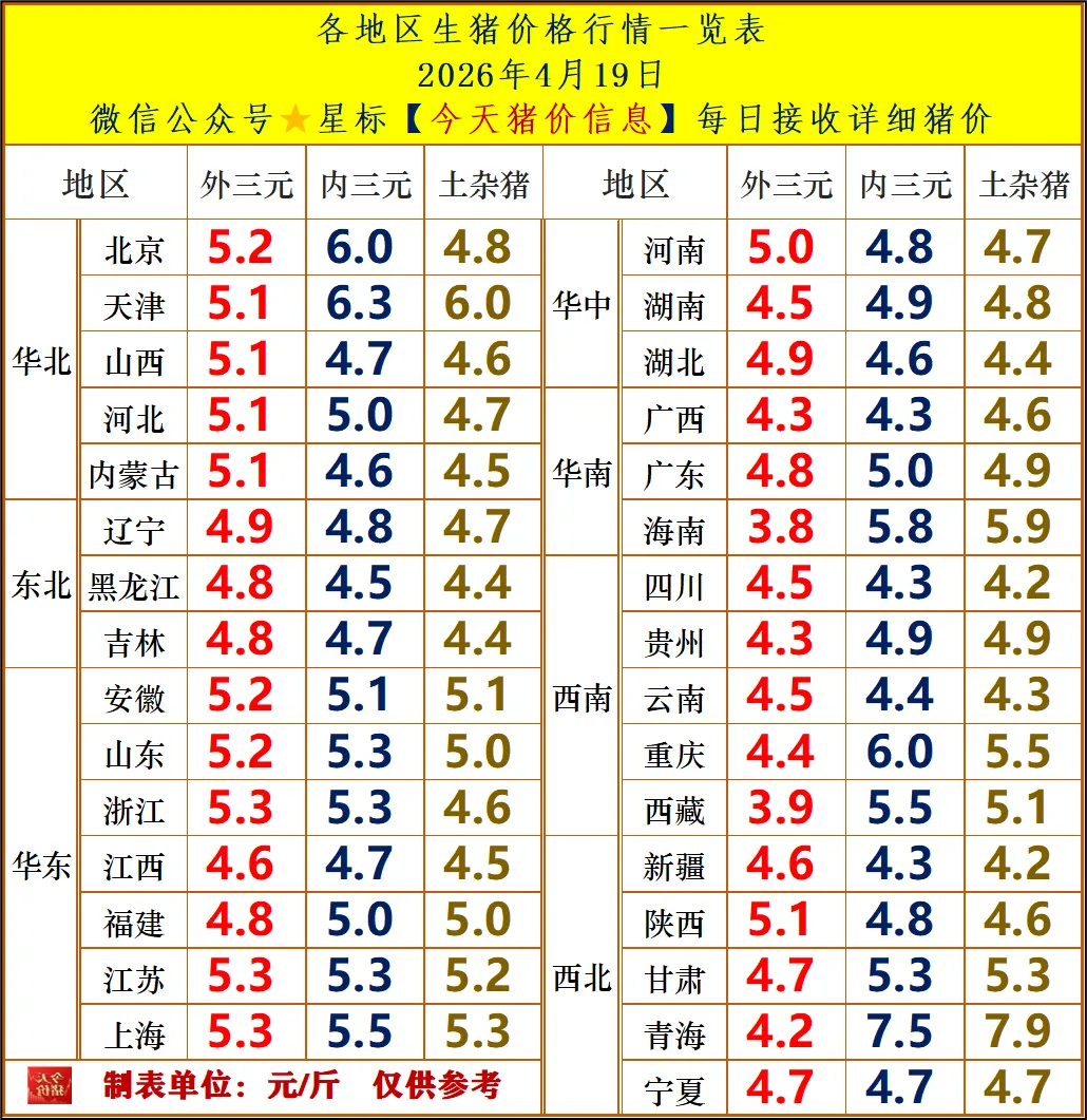 今日猪价 | 2026.4.20明天猪价早知道!2026年04月19日猪价行情: 外三元:4.81元/斤,较昨日上涨0.17元 内三元:4.86元/斤,较昨日上涨0.05元 土杂猪:4.25元/斤,较昨日上涨0.05元