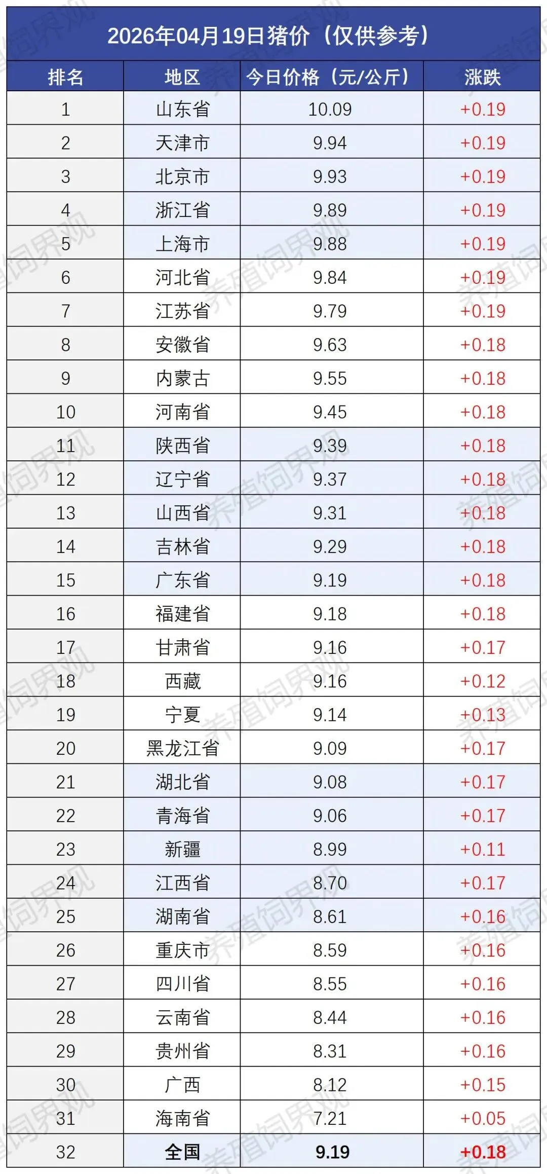 4月19日全国猪价 | 全部上涨!全国31省飘红,一省重回10元
