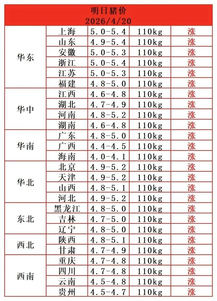 【明天猪价】2026.04.20(飘红一片,全国大涨!)