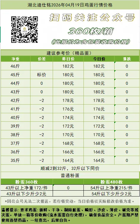湖北迪仕铭2026年04月19日鸡蛋行情价格 养羊网 2026-04-19 湖北迪仕铭2026年04月19日鸡蛋行情价格 养羊网 2026-04-19 上一篇:今日猪价 | 2026.4.20,明天猪价走势! 下一篇:今日猪价|【2026.4.19】最新猪价信息查询 您可能还会对下面的文章感兴趣111: 相关文章 山东成武县盛茂品养蛋鸡赚百万元 【3月26日】毛鸡、鸡苗、鸡蛋价格预报 2025年4月13日全国各地生猪价格信息 厦门祥店|遇见楼兰—top级别新疆菜!!