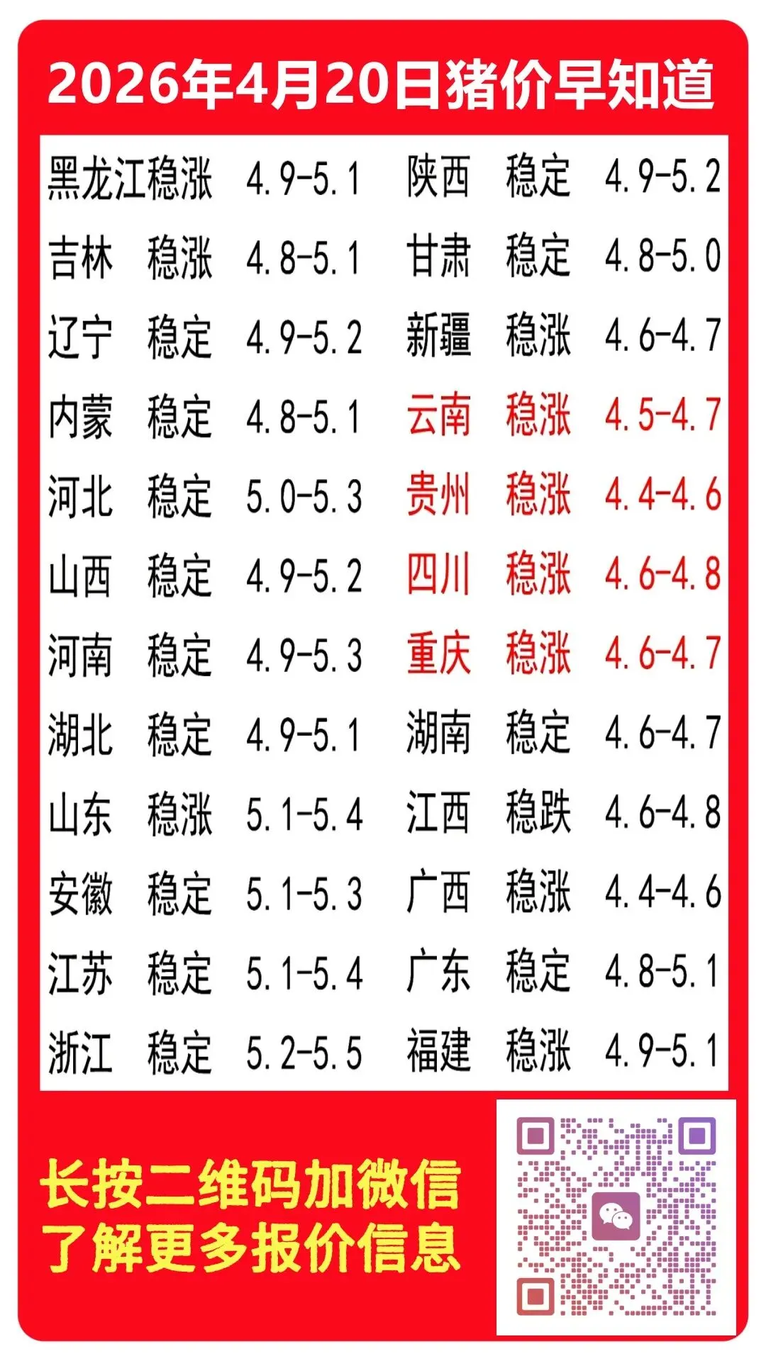猪价上涨熄火?2026年4月20日多省猪价继续上涨!! 养羊网 2026-04-19 猪价上涨熄火?2026年4月20日多省猪价继续上涨!! 养羊网 2026-04-19 上一篇:猪价行情(2026.4.20)︱仅供参考 下一篇:4月19日广东地区猪价持续小幅上涨 您可能还会对下面的文章感兴趣111: 相关文章 2026年2月12日猪价报价信息! 2026 . 3 . 3 鸡蛋价格 别再死盯猪价了!决定你盈亏的,是这3个隐形成本 2025年4月13日全国各地生猪价格信息