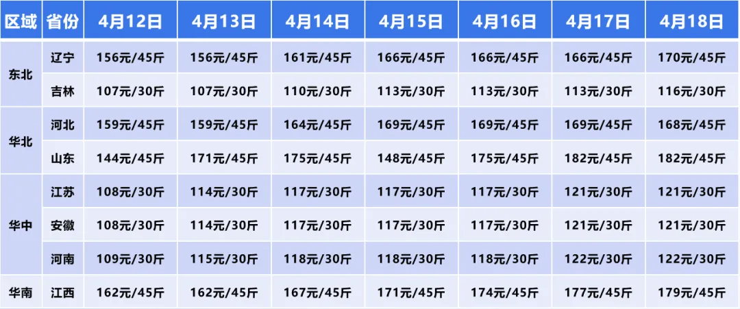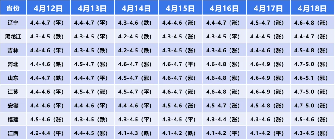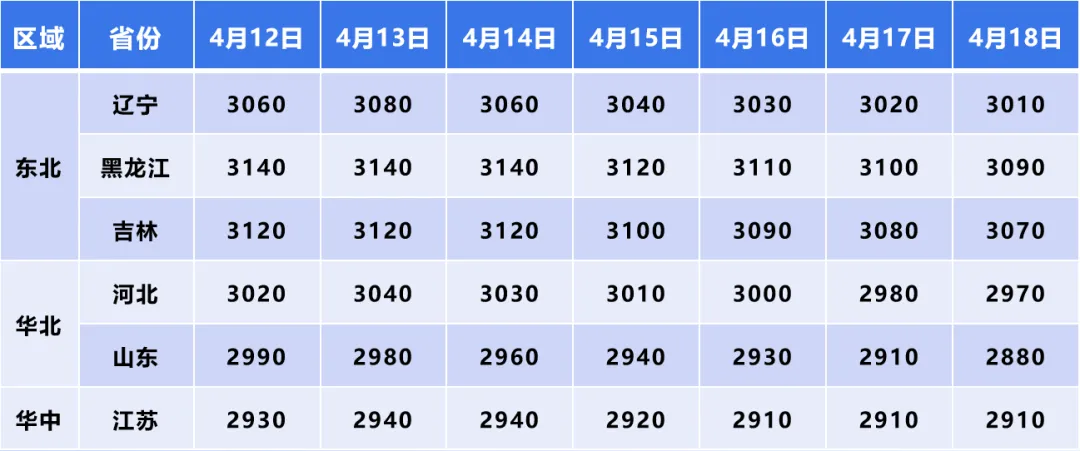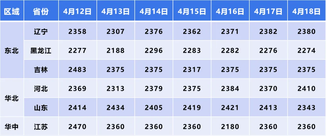 4月17日-18日,上涨态势进一步强化,河北、山东、江苏、安徽等省份价格持续抬升,东北三省也维持全面上涨,形成了多区域协同上涨的强势格局,价格重心持续上移。