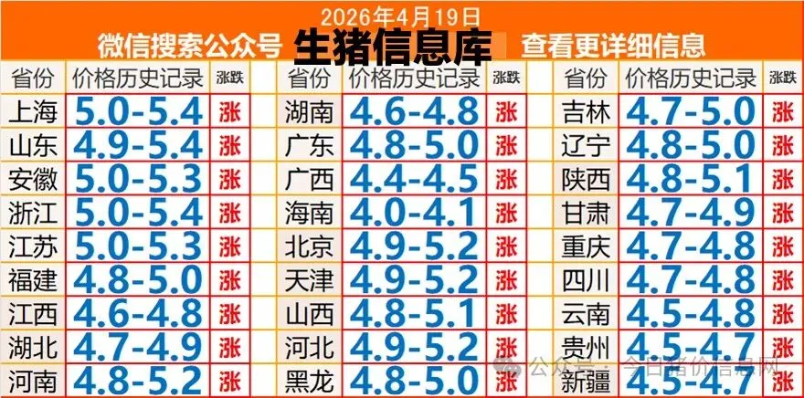 暴涨继续26.04.19猪价 养羊网 2026-04-20 暴涨继续26.04.19猪价 养羊网 2026-04-20 上一篇:周末现货猪价继续大涨,下周期货怎么看? 下一篇:反常识!猪价跌穿十年低位,猪肉股却逆势暴涨?2026年选股逻辑全拆解 您可能还会对下面的文章感兴趣111: 相关文章 1月23日东莞信立农批鸡蛋价格 2025年4月13日全国各地生猪价格信息 坐标阿德莱德 woolworth也有30个鸡蛋卖了 拼多多,騙多多