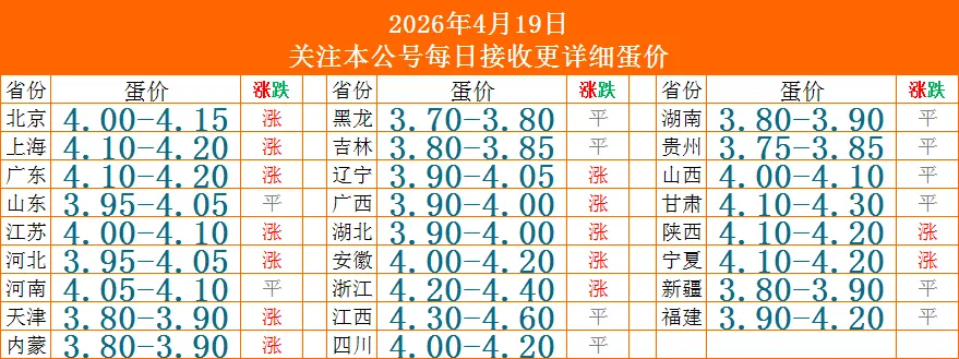 2026年4月19日全国鸡蛋价格3.90-4.20元/斤,均价较昨日上涨1毛左右,本周蛋价实现5连涨,全国鸡蛋价格呈现 ?“整体稳中偏强、区域分化明显” 的态势,主产区普遍站稳4元/斤关口,受节前备货拉动明显。仅供参考!