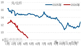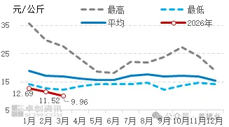 一季度生猪价格处于历史低位卓创资讯数据显示,近五年分月均价平均水平基本在“16-18元/公斤”箱体内运行,2026年生猪价格已显著偏离长期中枢,处于近五年同期低位。从季度内来看,一季度生猪价格短暂上涨后快速下探,卓创资讯数据显示,一季度生猪交易均价为11.36元/公斤,同比下滑24.88%,单日最低价已跌至9.41元/公斤,为近十五年历史低点。