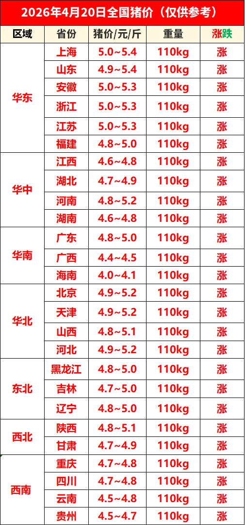 4月20日全国猪价涨涨涨!上涨“一片红”!每一滴雨,都在奔赴希望|谷雨,质德同行. 养羊网 2026-04-20 4月20日全国猪价涨涨涨!上涨“一片红”!每一滴雨,都在奔赴希望|谷雨,质德同行. 养羊网 2026-04-20 上一篇:4月20日南宁、柳州、桂林鸡蛋价格参考 下一篇:猪价全线飘红,养殖端迎来曙光! 您可能还会对下面的文章感兴趣111: 相关文章 深究鸡蛋茶 2026年1月22日宁城鸡蛋价格早报 2025年4月13日全国各地生猪价格信息 慈溪首家蒙古包特色餐厅10.18日正式开业啦