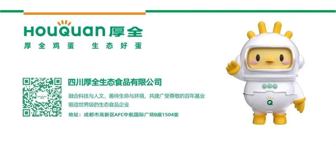 四川厚全生态食品有限公司(厚全集团)是一家饲料加工、蛋鸡养殖、鸡蛋生产、分级加工与销售,有机肥研发、生产与销售为一体的蛋鸡全产业链运营商。立足四川,布局全国,以消费市场和物流节点为重点,依托数智化生产、加工、流通、物流、品牌、电商于一体的产业与金融融合创新发展模式,多维度保障蛋品安全、营养、新鲜、可追溯。