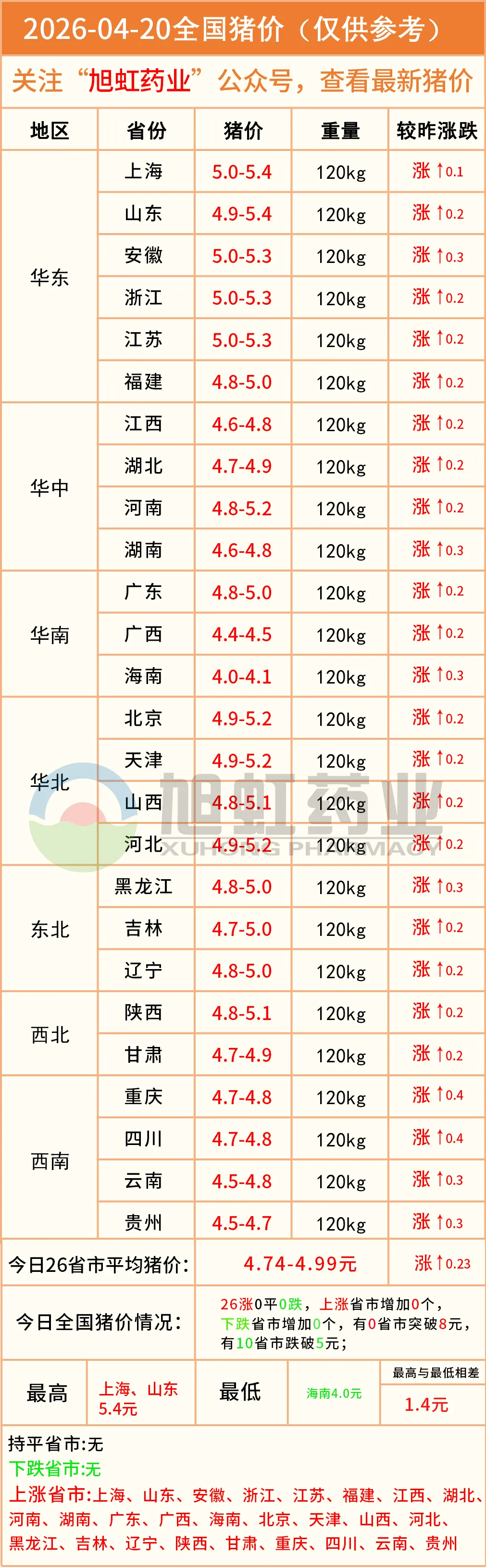 明日猪价——2026年04月20全国生猪价格! 养羊网 2026-04-20 明日猪价——2026年04月20全国生猪价格! 养羊网 2026-04-20 上一篇:4月20日最新:鸡蛋、大豆油价格(贵州六盘水),今日谷雨,春天最后一个节气,雨生百谷,天地福临,播种希望,收获幸福,涨! 下一篇:2026 年 4 月 20 日猪价、肉价信息 您可能还会对下面的文章感兴趣111: 相关文章 千户苗寨(附攻略) 2025年4月13日全国各地生猪价格信息 猪价跌到“自由”,你的财富“自由”还远吗? 猪价180°大变、僵持偏弱!