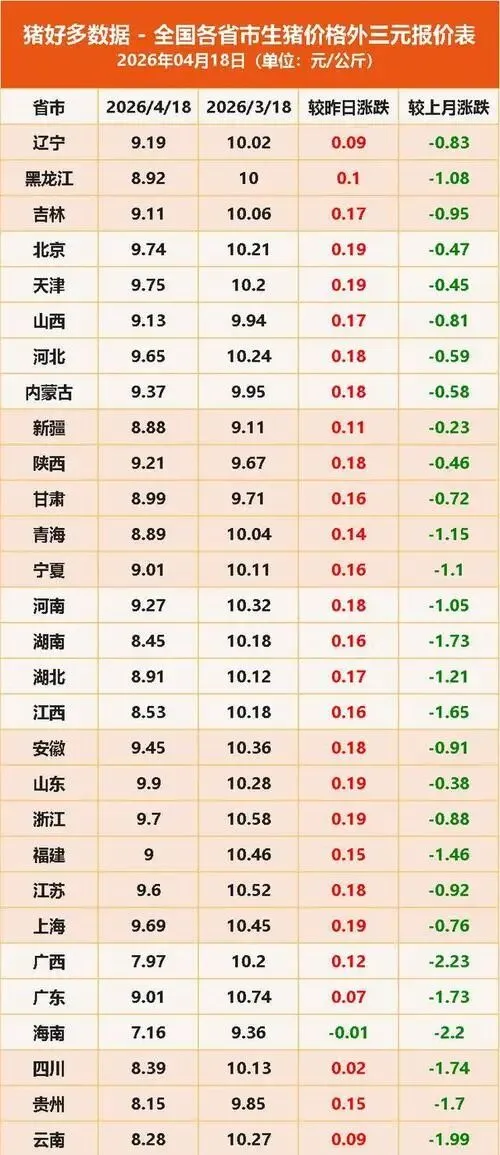 4月18日,全国外三元生猪均价冲至9.01元/公斤,两天累计上涨< strong>0.32元,看似一场“反攻”,实则更像一场迟来的喘息。