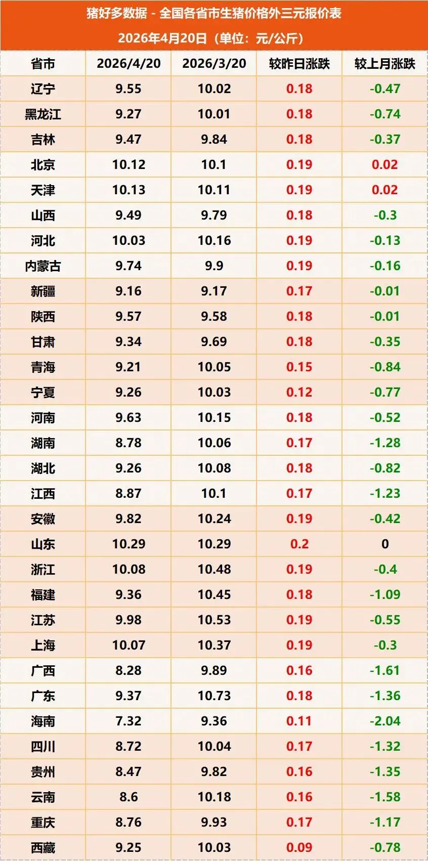 据猪好多数据监测显示,2026年4月20日全国外三元生猪均价为9.37元/公斤,较昨日再上涨0.18元/公斤,全国范围内,31省市猪价延续集体“飘红”态势,特别是北京、天津、河北、山东、浙江、上海已重回10元/公斤。
