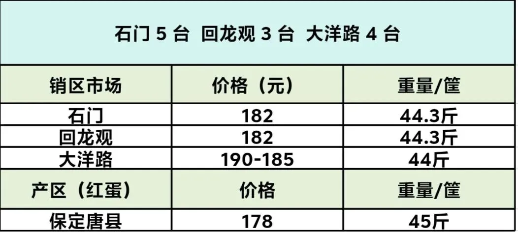 大洋路鸡蛋价格2026年 4 月 20 日报价 养羊网 2026-04-20 大洋路鸡蛋价格2026年 4 月 20 日报价大洋路 4 台,价格 190-185 元,截止午后没有剩车,走货正常,明天回车3-4 台附近。 养羊网 2026-04-20 上一篇:【河南?南阳鸡蛋价格播报】2026年4月20日 下一篇:猪价连续5日大涨,4月20日全国均价9.77元/公斤 您可能还会对下面的文章感兴趣111: 相关文章 3月20日全国最新鸡蛋价格:平心静气,无波无澜. 2月1日广西鸡蛋价格参考,广西跌 吐槽一下高物价和预制菜 五元牧羊纸币值多少钱