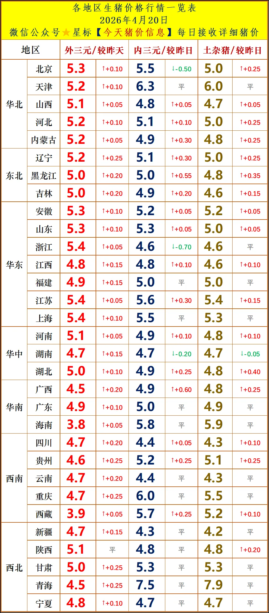 今日猪价 | 2026.4.21明天猪价最新信息!2026年04月20日猪价行情: 外三元:4.95元/斤,较昨日上涨0.13元 内三元:5.01元/斤,较昨日上涨0.16元 土杂猪:4.83元/斤,较昨日上涨0.18元