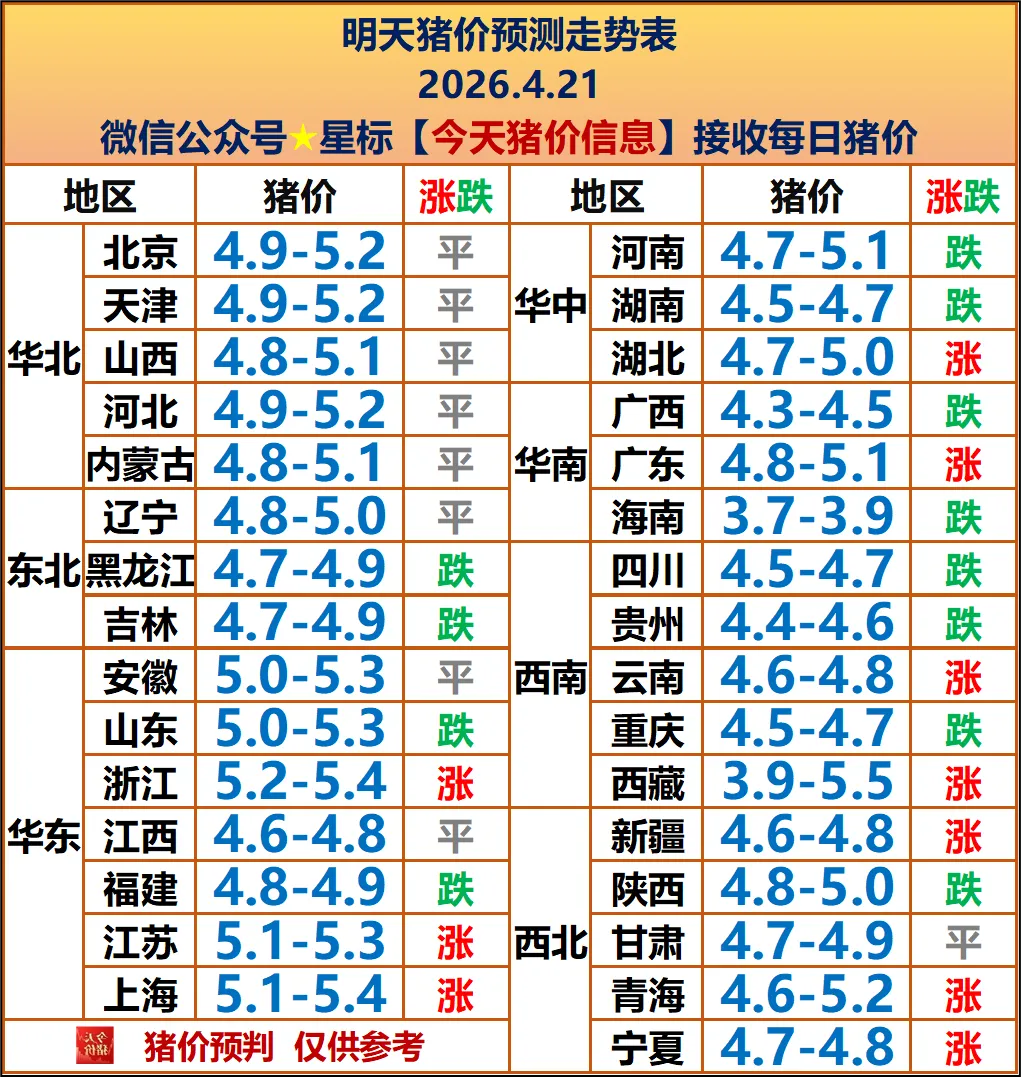 明天4月21日全国外三元猪价稳中微涨、北强南弱,均价约 9.7-9.9 元 / 斤(4.85-4.95 元 / 斤),涨 0.05-0.1 元 / 斤。华北、华东领涨至 5.0-5.2 元 / 斤;东北、华中小幅回暖;华南、西南底部企稳、涨幅有限。