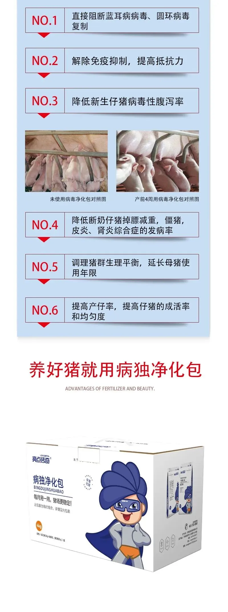 ?《病毒净?化包》十几年经久不衰,靠的就是回头客!特异性针对5大毒病?猪瘟、蓝耳、圆环、伪狂犬、口蹄疫,非特性异?提高机体疫免?力。减少猪?体内的野毒,提高机?体免疫力?!