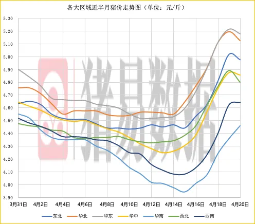 西南、华南、地区猪价呈现上涨,东北、西北、华北、华中、华东地区猪价呈现下跌,生猪平均价格微幅下跌。