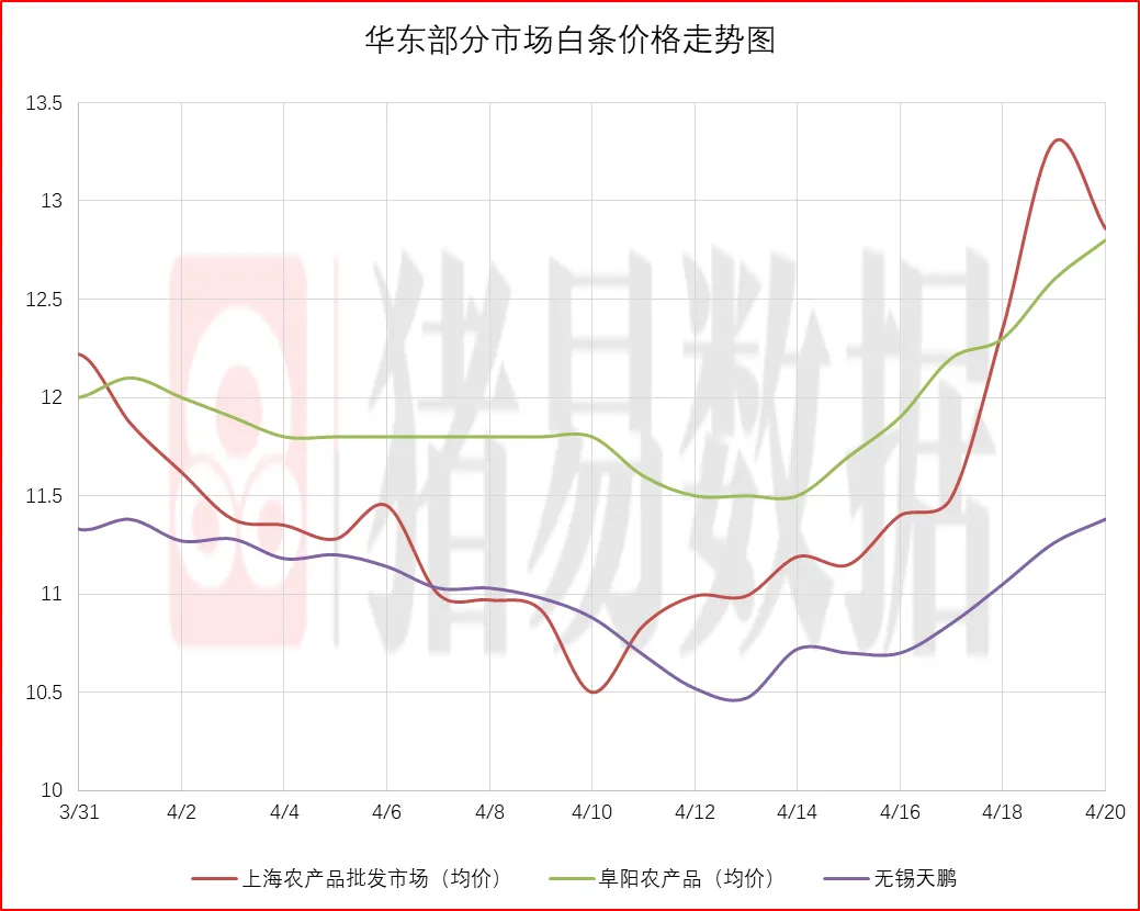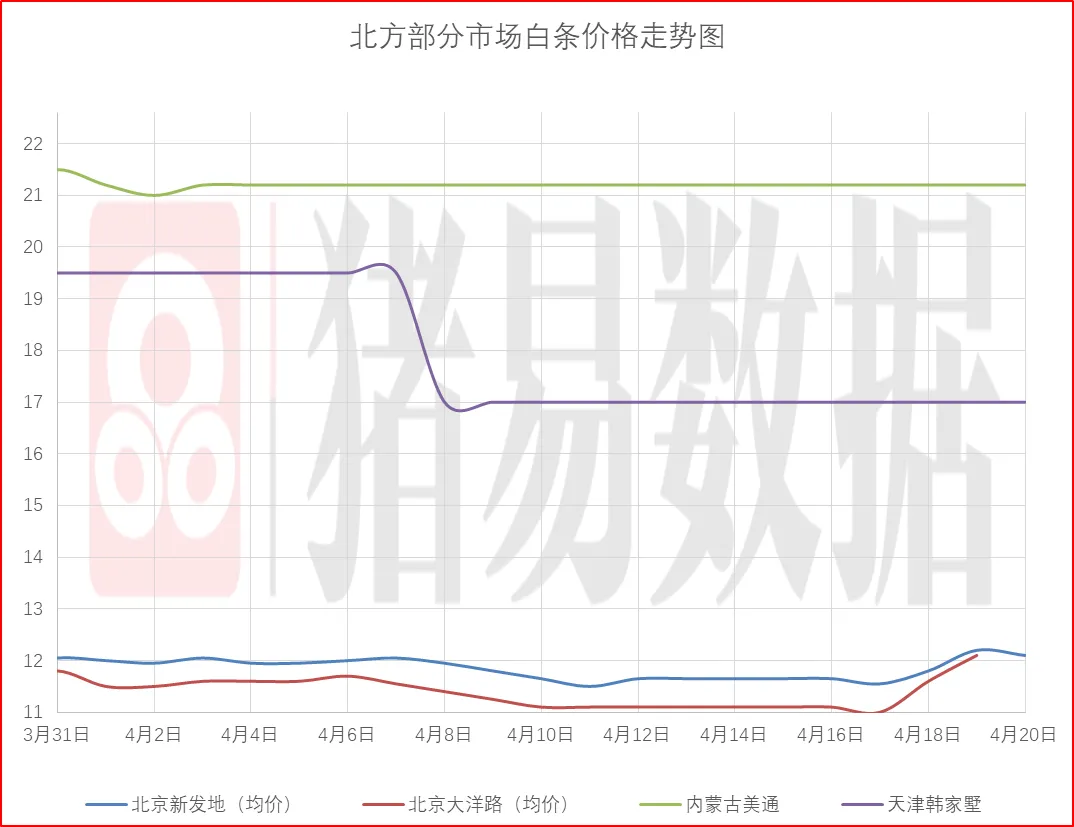 从今日北京、上海消费城市批发市场白条价格走势来看,北京、上海批发市场白条开磅价格呈现跌涨调整,北京大部分市场开磅价格维持稳定,市场走货速度表现一般;上海市场价格呈现下跌态势,部分市场成交价参考12.38-12.86元/公斤,到货量表现有所增加,市场交易情况表现一般偏差,市场成交均价表现一般偏差。