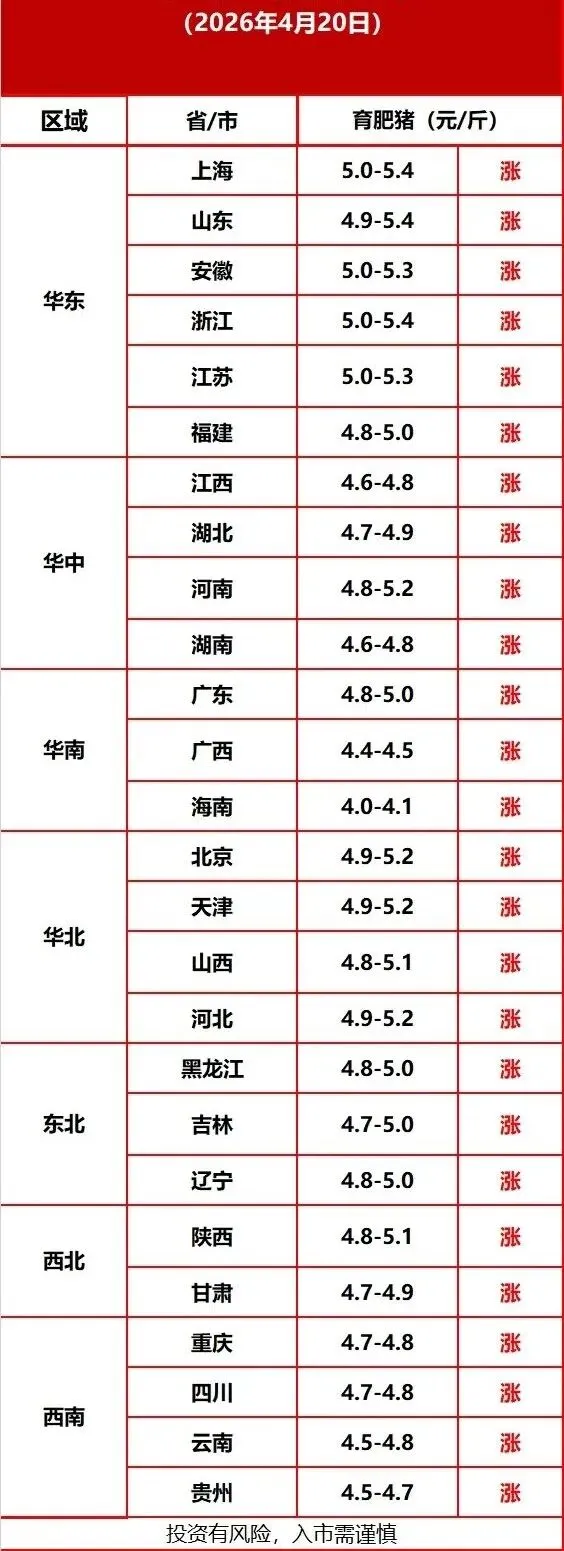 4月20日猪价 全线上涨 养羊网 2026-04-20 4月20日猪价 全线上涨每日猪价行情4月20日猪价点点赞推 荐 阅 读中东战火如何烧高我们的猪饲料?养猪人必看的成本预警!真金白银!温氏股份拟最高12亿回购,向市场释放最直接信号美国大豆想回中国餐桌?13%关税挡路,巴西笑了www.chinabreed.com中国养殖网编辑:郑高兴来源:中国养殖网、网络 养羊网 2026-04-20 上一篇:2026年4月21日猪价行情观点和操作建议 下一篇:2026.4.21-伞猪明日猪价-分化!涨跌互现! 您可能还会对下面的文章感兴趣111: 相关文章 1月5日广西鸡蛋价格参考;广西涨; 猪价早知道20260312日跌涨调整 2026年3月18日共青城鸡蛋价格优源商行提供.仅供参考! 近期价格更新!!!