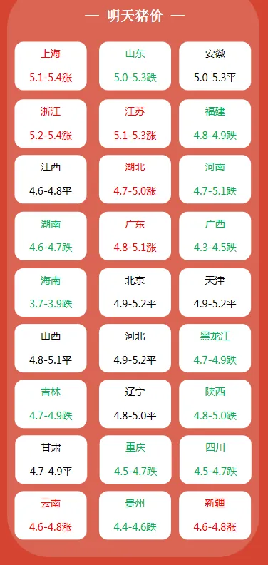 2026.04.21-明天猪价(多地飘红!涨跌分化!) 养羊网 2026-04-20 2026.04.21-明天猪价(多地飘红!涨跌分化!) 养羊网 2026-04-20 上一篇:2026年4月21日 全国猪价 大涨 下一篇:2026.4.21明日最新猪价 您可能还会对下面的文章感兴趣111: 相关文章 2025年4月13日全国各地生猪价格信息 明日猪价(2026年04月14日) 西南地区鸡蛋价格参考,04月10日 今日鸡蛋价格行情,蛋价预计啥时候能上涨?