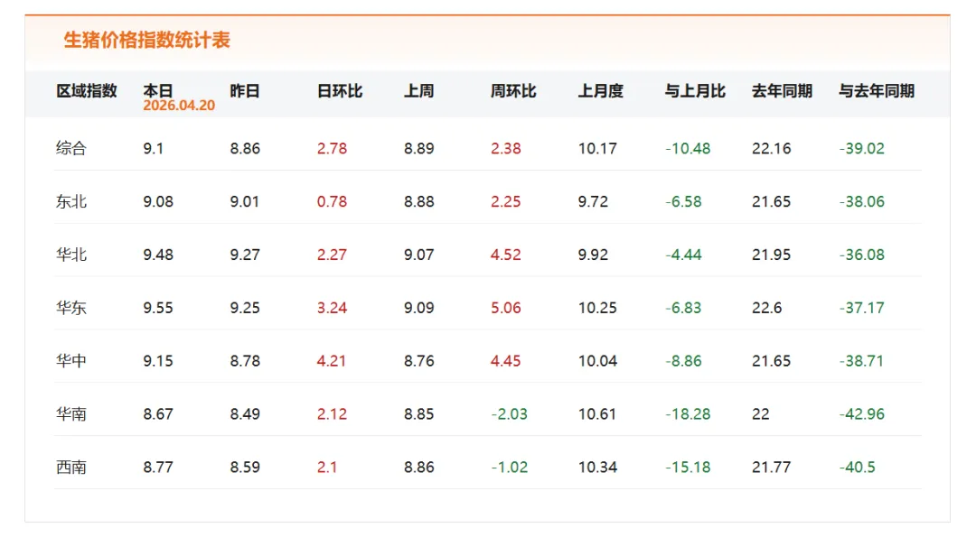 2026年4月19日,中国主流市场出栏外三元、内三元及土杂商品大猪加权日均价较昨日价格上涨,全国生猪出栏加权日均价9.57每公斤,较昨日价格上涨2.93%。受节前备货需求提振、养殖端惜售扛价以及政策稳价预期支撑,猪价持续回升,行业亏损有所收窄,短期行情仍偏强运行,但整体产能依旧宽松,本轮反弹空间相对有限。今日全国外三元、内三元及土杂猪均价如下:1) 主流市场外三元大猪全国销售均9.68元每公斤,较昨天价格上涨2.82%;2)主流市场内三元大猪全国销售均价9.32元每公斤,较昨天价格上涨3.31%;3)主流市场土杂大猪全国销售均价8.91元每公斤,较昨天价格上涨3.09%。