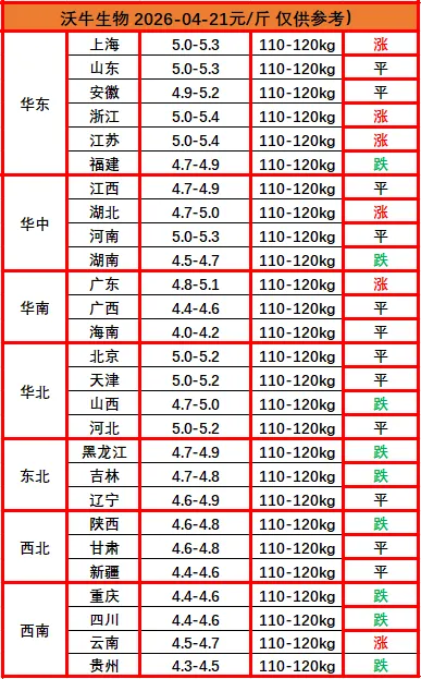 ? ? 猪价播报沃小牛,助力养猪牛牛牛!各位养猪的老铁们,大家好!我是沃小牛,明天是2026年04月21日,最新猪价已经出来了:猪价再联系上涨5天之后明天进入调整节奏状态,连续5日上涨后,获利盘兑现、出栏意愿回升,屠企备货节奏放缓,压价意愿增强。因此明天全国猪价大概率小幅调整、稳中偏弱,备货节奏放缓、出栏逐步回归理性。五一前整体震荡偏强、窄幅上行,均价或摸至5.0–5.2元/斤,但无趋势反转、大涨空间有限。给养猪人的操作建议:?逢高出栏:5.0元/斤以上逐步出栏,不盲目压栏赌大涨,锁定阶段性利润。分批出栏:4.25–4.30为备货高峰,价格或有小幅冲高,把握窗口。理性预期:此轮为超跌反弹+季节性备货,非周期反转,5月节后或小幅回落。