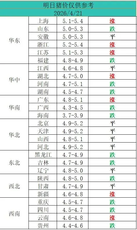 2026年4月21日全国猪价信息/供大家参考 养羊网 2026-04-20 2026年4月21日全国猪价信息/供大家参考 养羊网 2026-04-20 上一篇:明日猪价——2026年04月21全国生猪价格! 下一篇:2026.4.21明日猪价(基层明日猪价!) 您可能还会对下面的文章感兴趣111: 相关文章 2025年4月13日全国各地生猪价格信息 315不再迷信土鸡蛋? 2025年4月13日全国各地生猪价格信息 2026年3月7日猪价行情信息