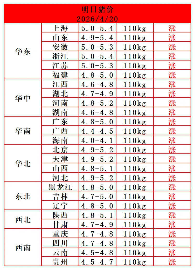 猪价回涨!2026.04.20鼎王猪价播报早知道! 养羊网 2026-04-20 猪价回涨!2026.04.20鼎王猪价播报早知道!立马收到明天最新猪价鼎王金猪就是长得快!订购电话:13980400130 养羊网 2026-04-20 上一篇:涨跌互现!2026.4.21明日猪价,猪价稳中回落 下一篇:猪价重回5元!2026.04.21鼎王猪价播报早知道! 您可能还会对下面的文章感兴趣111: 相关文章 截止今日,7月盈利17.4w 【明日猪价】2026.2.24全国猪价! 2025年4月13日全国各地生猪价格信息 2025年4月13日全国各地生猪价格信息