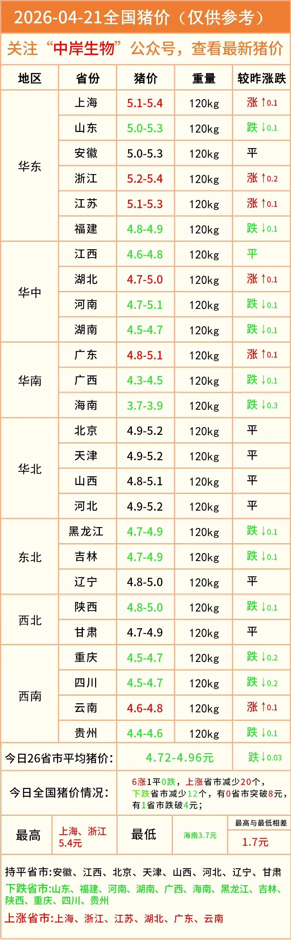 明日猪价|2026-04-21全国最新猪价(猪价已更新!) 养羊网 2026-04-20 明日猪价|2026-04-21全国最新猪价(猪价已更新!)营销中心丨0731-83806009技术服务丨0731-83806019 养羊网 2026-04-20 上一篇:4月20日浙江省猪价日报 下一篇:2026年4月20号鸡蛋价格:整体趋稳,零星上涨. 您可能还会对下面的文章感兴趣111: 相关文章 猪价创20年新低,猪肉股逆势三连涨 近期价格更新!!! 关于鸡蛋的一些看法 2026-01-08今日猪价