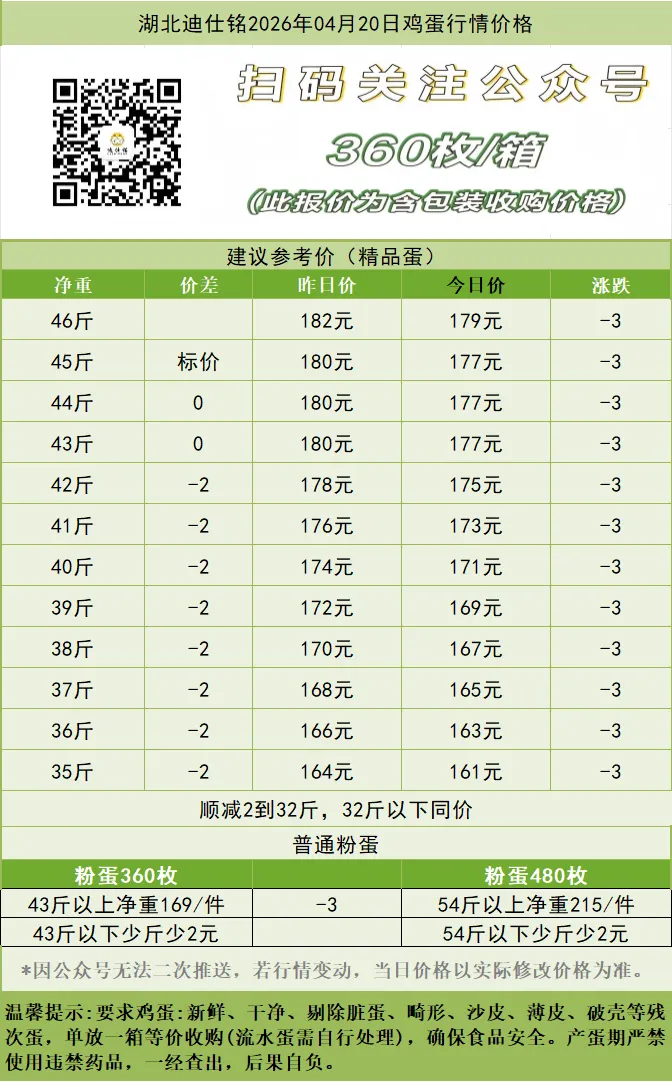 湖北迪仕铭2026年04月20日鸡蛋行情价格 养羊网 2026-04-20 湖北迪仕铭2026年04月20日鸡蛋行情价格 养羊网 2026-04-20 上一篇:稳,4月20日鸡蛋市场行情价格参考 下一篇:今日4月20日全国鸡蛋价格! 您可能还会对下面的文章感兴趣111: 相关文章 1月1日猪价来了! 26年3月12日—明日猪价 不是labubu买不起,而是拉猪猪更有性价比? 12月20日生猪价格:南北大场出栏增量