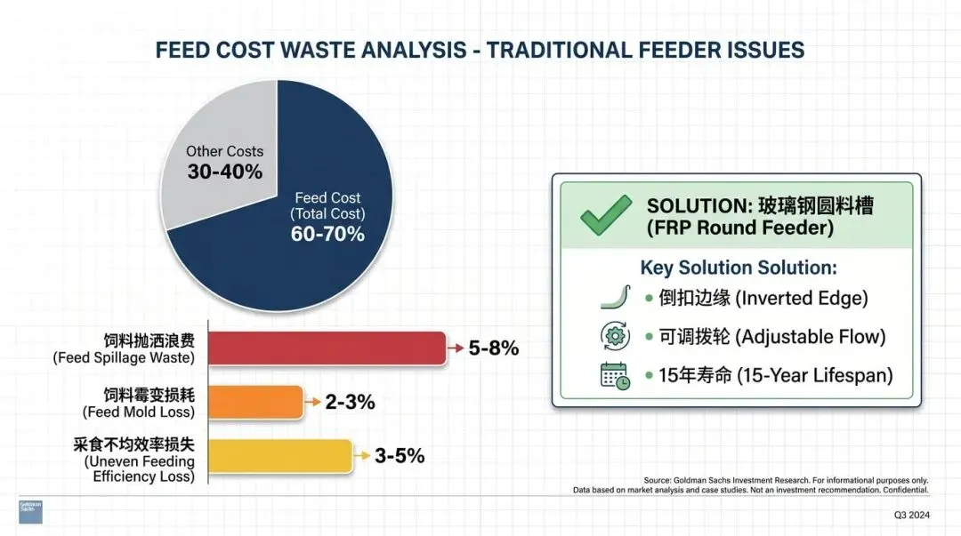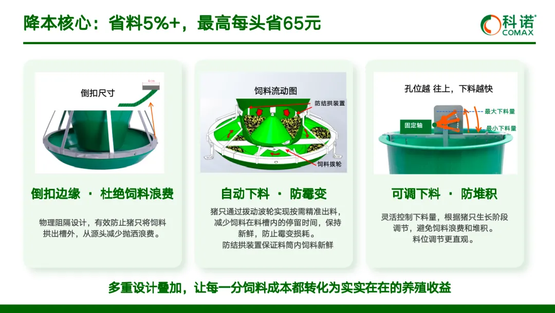 饲料成本占养猪总成本的 60-70%。传统料槽的设计问题导致:饲料被猪拱出踩在粪里,抛洒浪费率达 5-8%;料槽内饲料堆积发霉,造成二次损耗;采食不均导致生长速度差异,影响整体出栏效率。