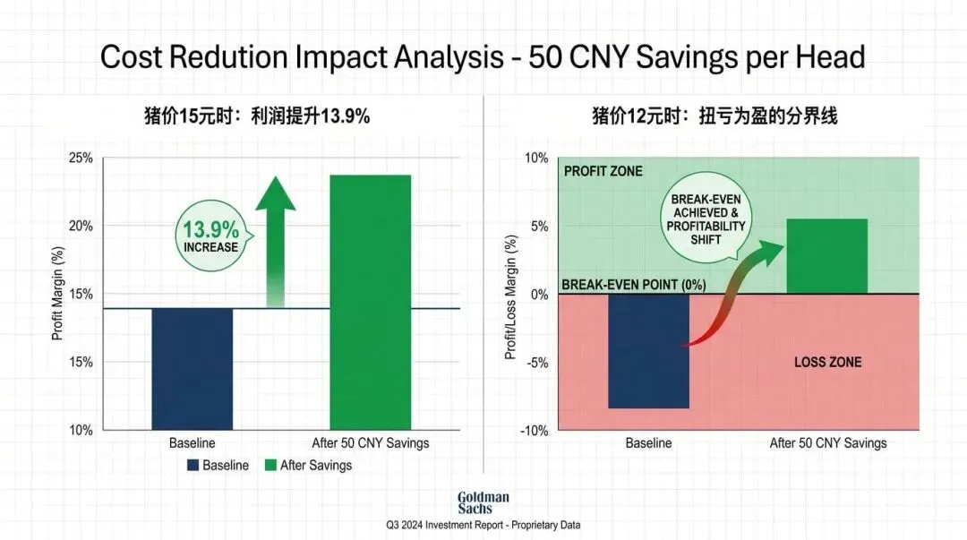 猪价低迷时,成本控制的价值被放大。猪价 15 元时,降低 50 元成本,利润提升 13.9%;猪价 12 元时,降低 50 元成本,可能是亏损与盈亏平衡的分界线。
