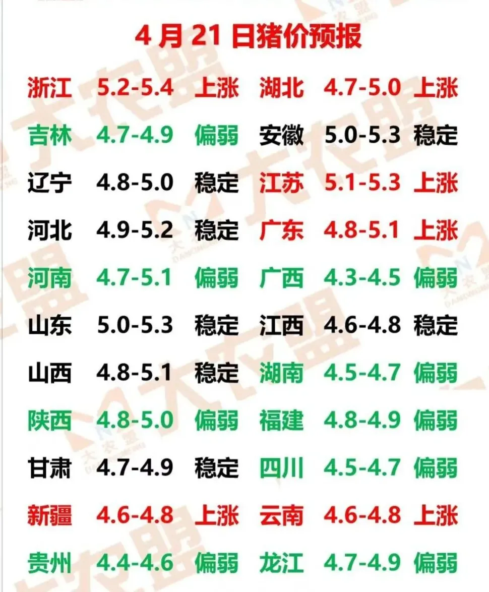 2026.04.21全国猪价信息(稳一稳还得涨价!) 养羊网 2026-04-20 2026.04.21全国猪价信息(稳一稳还得涨价!) 养羊网 2026-04-20 上一篇:猪价回暖,总算可以喘口气了,这几点数据值得关注! 下一篇:4月21日猪价来了! 您可能还会对下面的文章感兴趣111: 相关文章 明日猪价【2026年1月1日】全面上涨!全国猪价来啦! 2026年3月13日东莞大岭山鸡蛋价格早报 高品质鸡蛋批发,品质与实惠兼得! 2026年2月28日最新鸡蛋价格