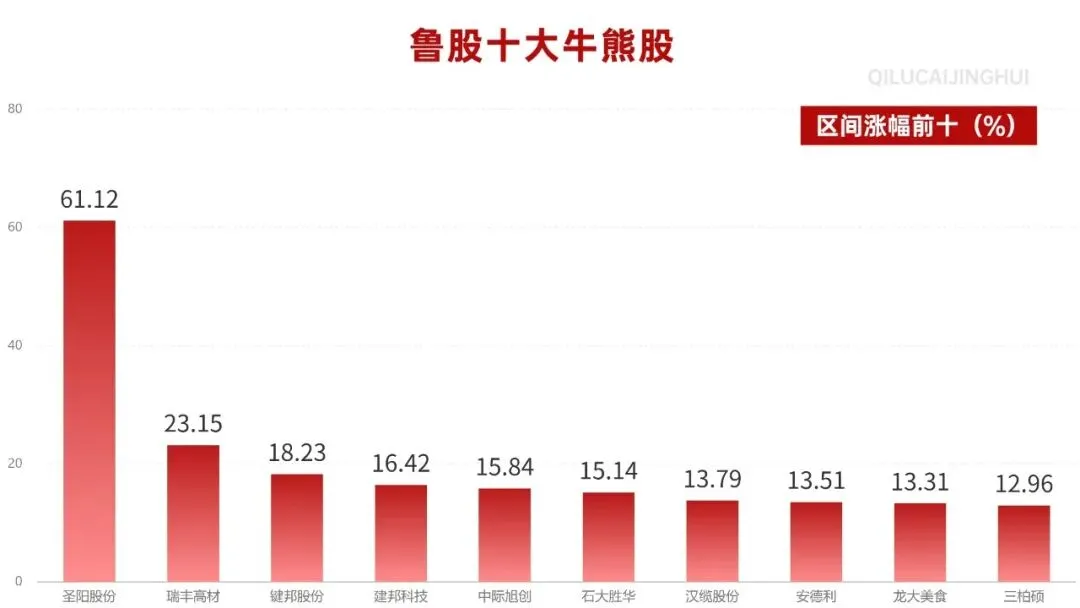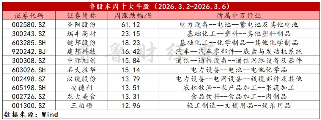 上周,山东板块上涨4.28%,圣阳股份上涨61.12%,瑞丰高材上涨23.15%,键邦股份上涨18.23%。